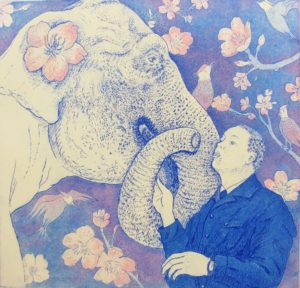 写真の銅版画は、ゾウはな子さんと、30年間はな子の飼育を担当された山川清蔵さん