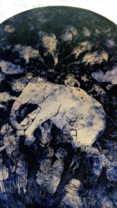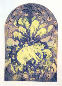 この版画、井の頭自然文化園で暮らしたゾウの物語画集 「今、はな子が笑った!」で最後のページに使った挿絵をもとに、時間をかけて色版にしたものだ。
