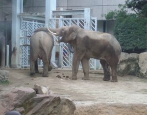 動物慰霊碑のすぐ隣では、象2頭が仲睦まじそうな様子。